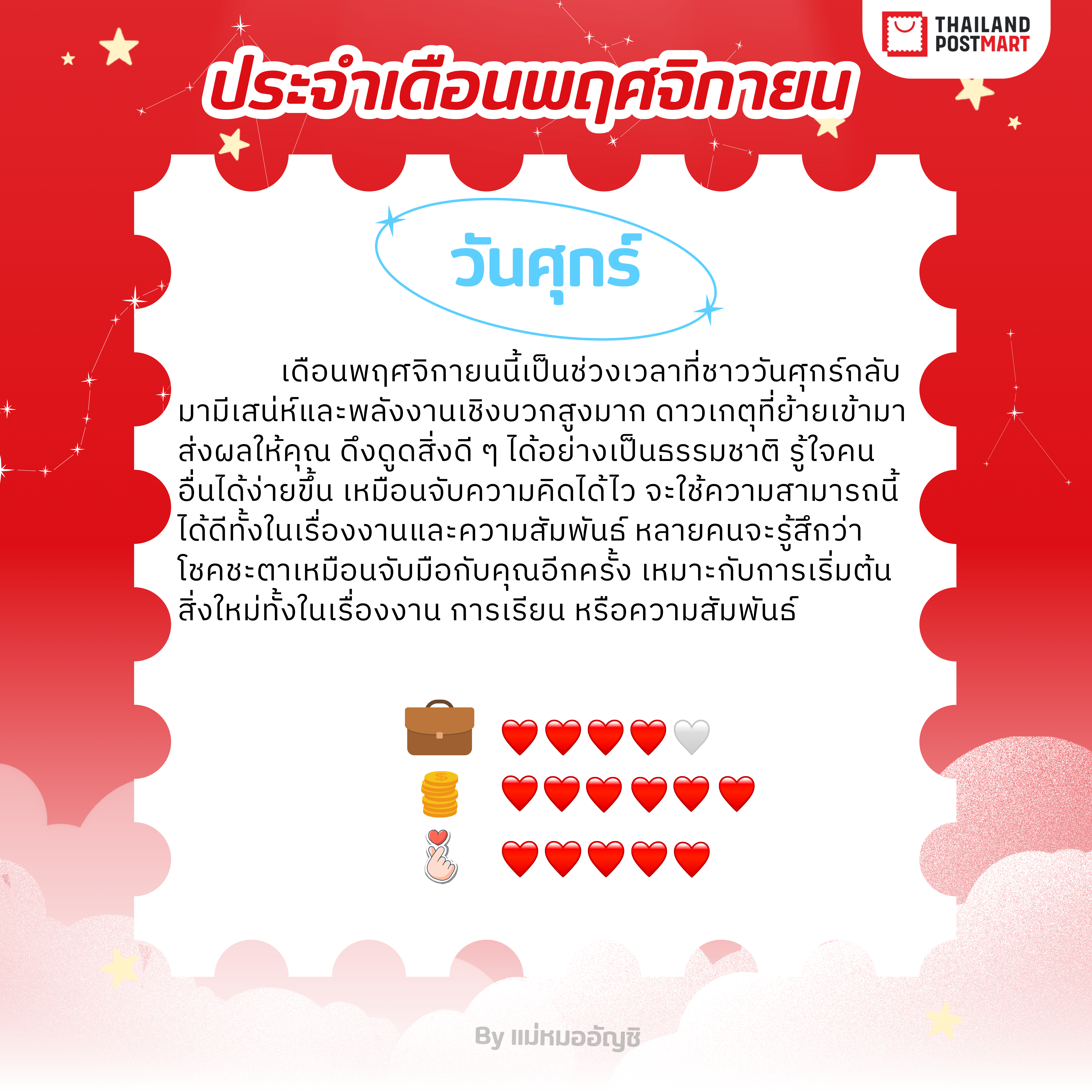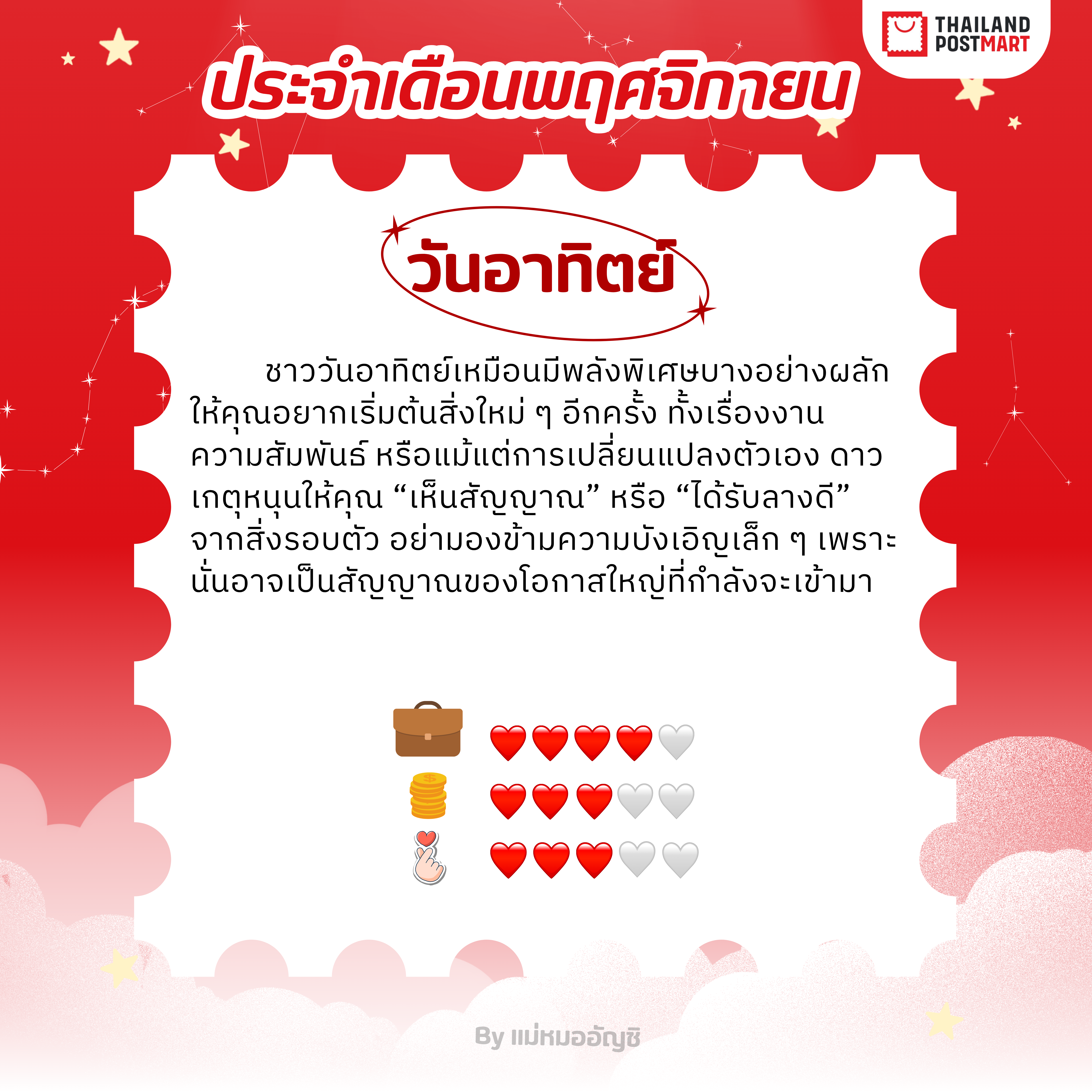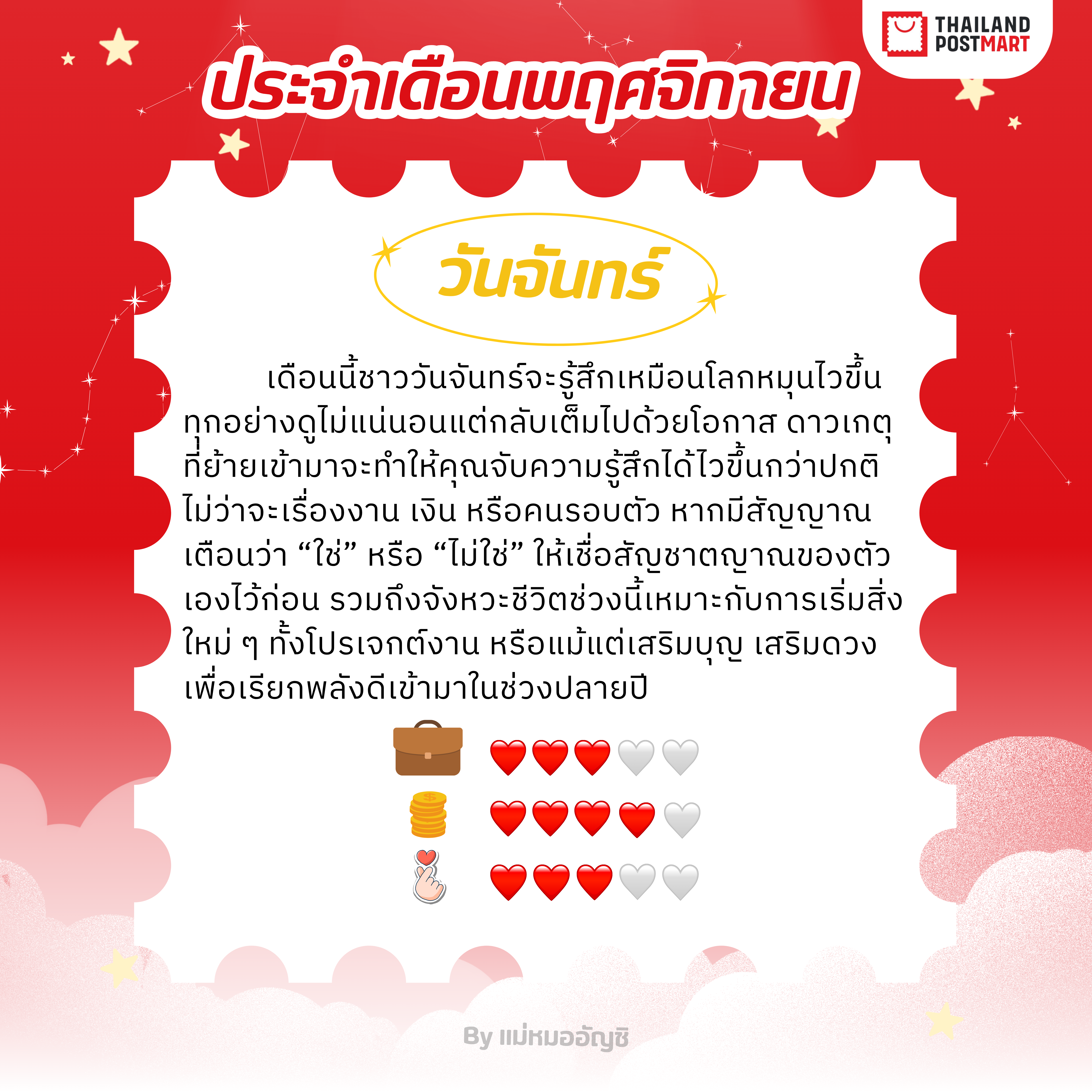 คนโสด > ลางสังหรณ์เรื่องความรักของคุณแม่นมาก อาจมีใครบางคนเข้ามาในจังหวะที่คุณไม่ได้คาดคิด เป็นความสัมพันธ์ที่เริ่มจากการพูดคุยเรื่องงานหรือความสนใจคล้ายกัน อาจจะเข้ามาจากสายงานหรืองานอีเวนต์ แต่แนะนำให้เริ่มจากการพูดคุยเชิงเพื่อนก่อน อย่าเพิ่งรีบร้อน