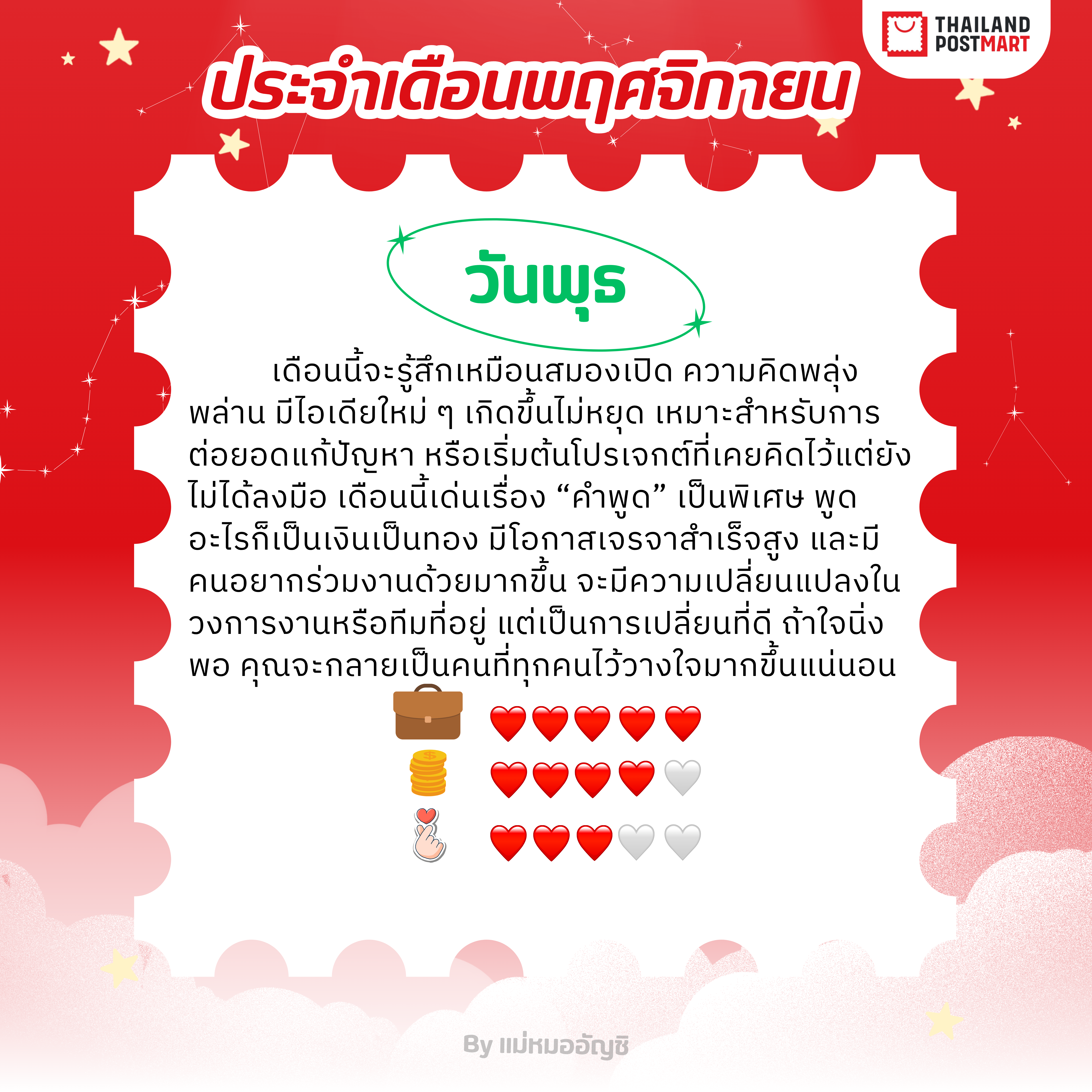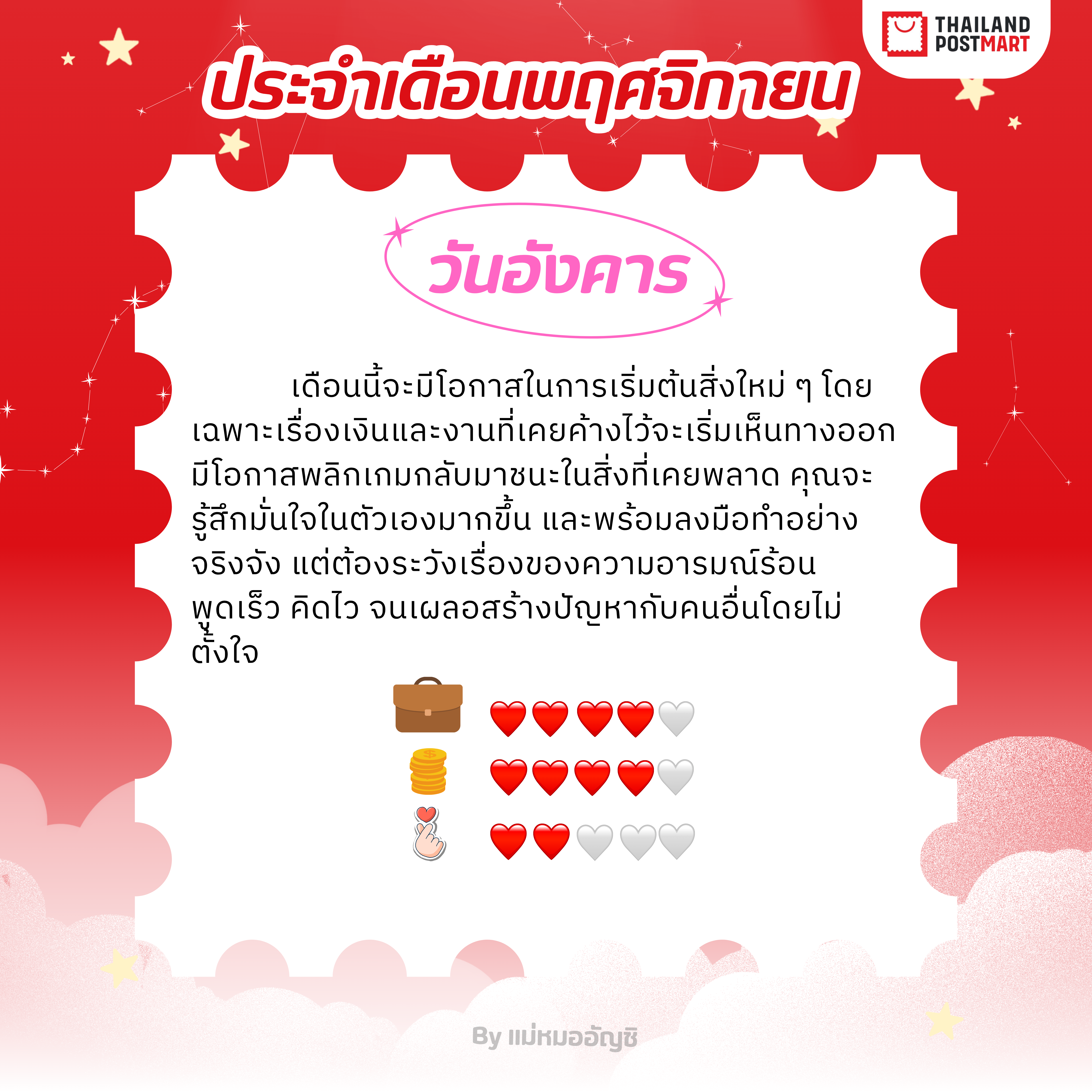 ในเดือนนี้เหมาะกับการเจรจา งานขาย การพรีเซนต์โปรเจกต์ หรือทำคอนเทนต์ออนไลน์ต่าง ๆ ใครที่ทำงานสายสื่อสาร การตลาด หรือบริการ มีแนวโน้มจะโดดเด่นเป็นพิเศษ แต่ต้องระวังความคิดฟุ้งซ่าน หรือเปลี่ยนแผนกลางคัน ควรจดสิ่งสำคัญไว้เสมอเพื่อไม่ให้พลาดงานใหญ่