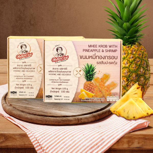ขนมหมี่ทองกรอบ รสสับปะรดกุ้ง ความอร่อยกรุบกรอบในแบบไม่เหมือนใคร ผลิตจากเส้นหมี่คุณภาพดี ผ่านการทอดจนเหลืองทองกรอบนาน ปรุงรสด้วยน้ำซอสสูตรพิเศษ เพิ่มความหอมหวานเปรี้ยวอย่างลงตัว ใช้สับปะรดพันธุ์ท้องถิ่นจากจังหวัดประจวบคีรีขันธ์ สดใหม่มีเอกลักษณ์ รสชาติเปรี้ยวอมหวาน หอมสับปะรดแท้ ไม่หวานเลี่ยน เพิ่มความอร่อยด้วยกุ้งแท้คุณภาพสูงจากทะเลไทย