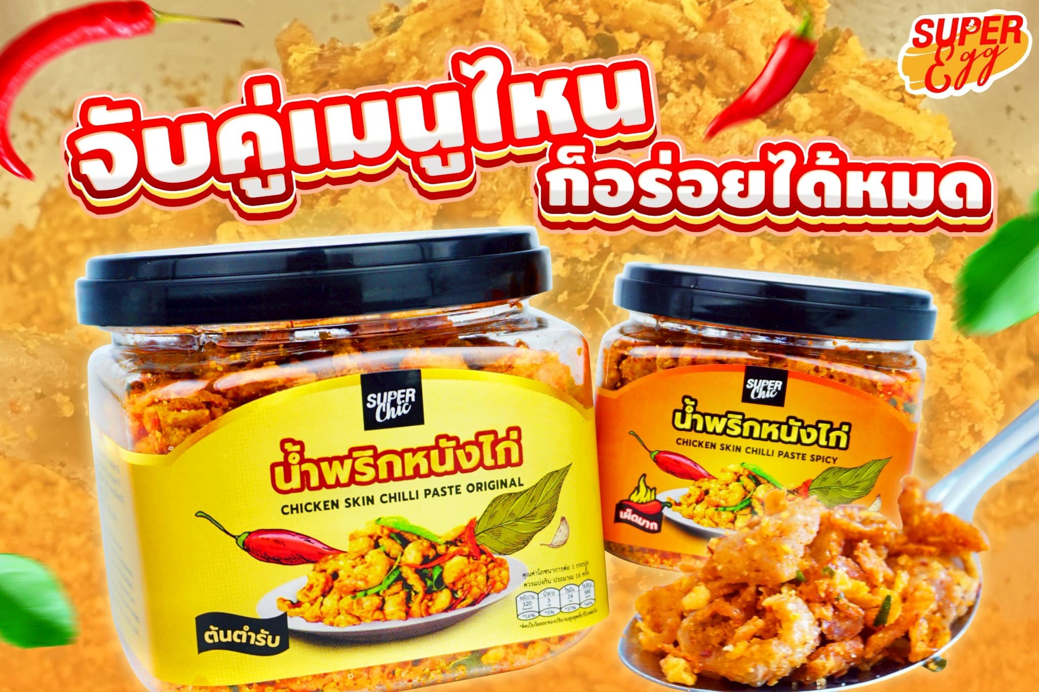 น้ำพริกหนังไก่กรอบ Super Chic คือความอร่อยที่รวมความกรอบ ความหอม และความแซ่บไว้ในกระปุกเดียว กินเมื่อไหร่ก็ฟิน อร่อยได้แบบไม่ต้องปรุงเพิ่ม