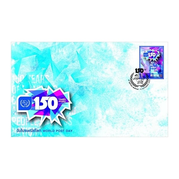 ภาพ: ภาพกราฟิกสีสันต่างๆ สื่อถึงการเฉลิมฉลอง 150 ปี UPU การเคารพความแตกต่าง และการติดต่อสื่อสารระหว่างผู้คน ประกอบข้อความ "150 ปี แห่งการสื่อสารและ สร้างพลังให้คนทั่วโลก"