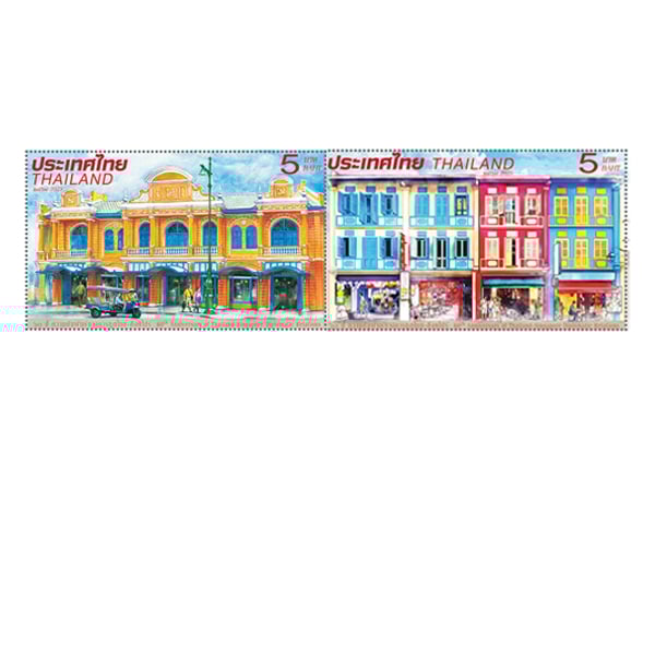 5.00 บาท (แบบที่ 1): ตึกเก่าย่านท่าช้าง ออกแบบโดย นายธเนศ พลไชยวงศ์ (บริษัท ไปรษณีย์ไทย จำกัด)