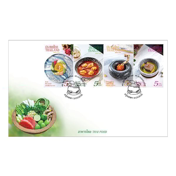 สินค้าที่จะได้รับ : ซองวันแรกจำหน่าย อาหารไทย 2568 จำนวน 1 ซอง (ผนึกแสตมป์ 4 ดวง)