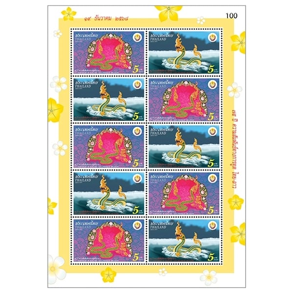 5.00 บาท (แบบที่ 1) : ภาพวาดพญาศรีสัตตนาคราชในเชิงสัญลักษณ์มีพระวรกายสีเขียวมรกตพระเศียรและปล้องพระนาภีสีทอง ในอิริยาบถพ่นน้ำและคายดอกบัว หมายถึงการเป็นผู้สร้างและพิทักษ์แม่น้ำโขง พร้อมทั้งยื่นมิตรภาพให้แก่ประเทศเพื่อนบ้าน ออกแบบโดย นายธเนศ พลไชยวงศ์ (บริษัท ไปรษณีย์ไทย จำกัด)