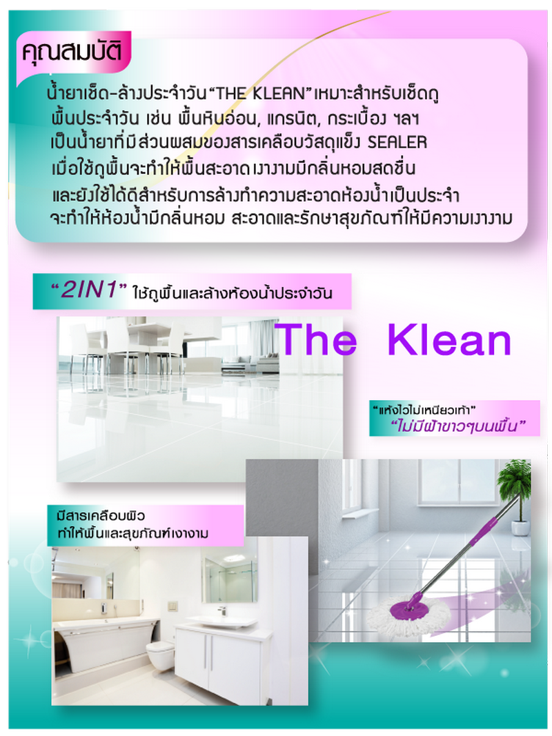 กรณีถูพื้น ใช้ ผลิตภัณฑ์เช็ด-ล้างประจำวัน เดอะคลีน The Klean 2 ฝา ผสมกับน้ำ ครึ่ง ถัง (20 ลิตร) ใช้ผ้าม๊อบชุบแล้วบิดพอหมาดจากนั้นเช็ดถูตามปกติ