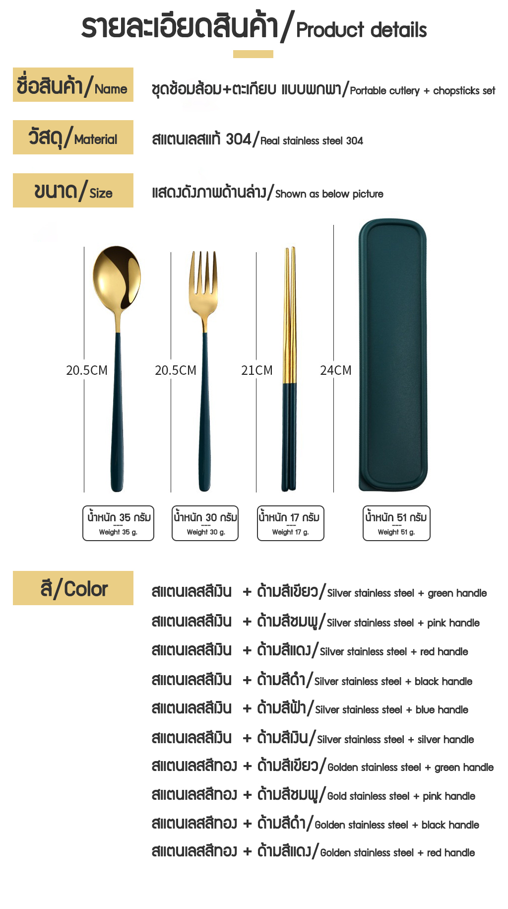 - มี 2 แบบ (สแตนเลส สีเงิน และสีทอง) พร้อมด้ามจับ 9 สีสวยงามค่ะ