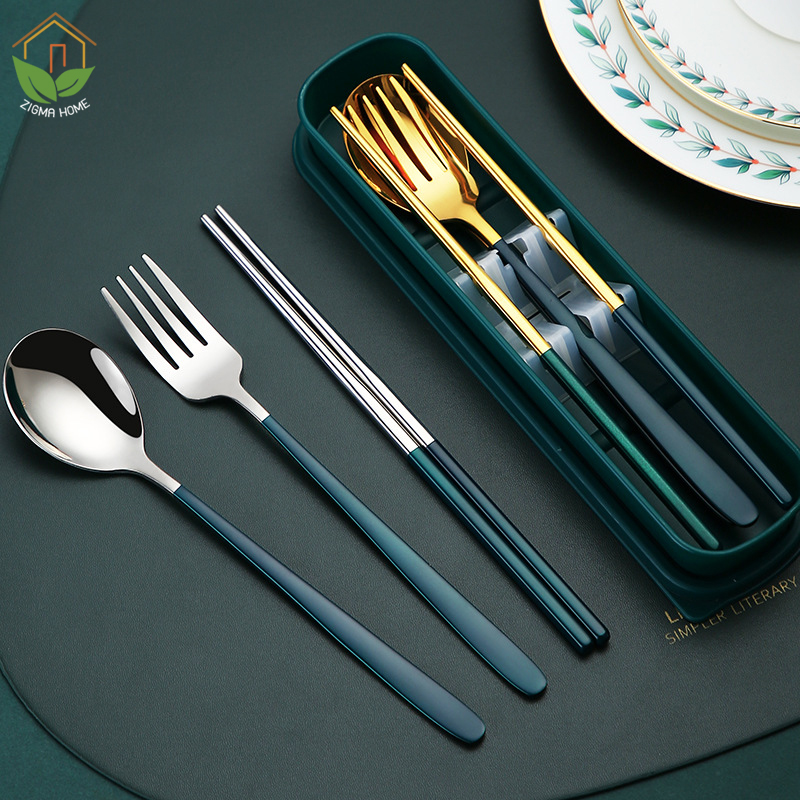 Zigma home - ช้อนส้อม ช้อนส้อมสไตล์เกาหลี ชุดช้อนส้อมสแตนเลสแท้ ชุดช้อนส้อมและตะเกียบสแตนเลสแท้ แบบพกพา พร้อมกล่องบรรจุ