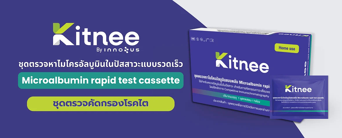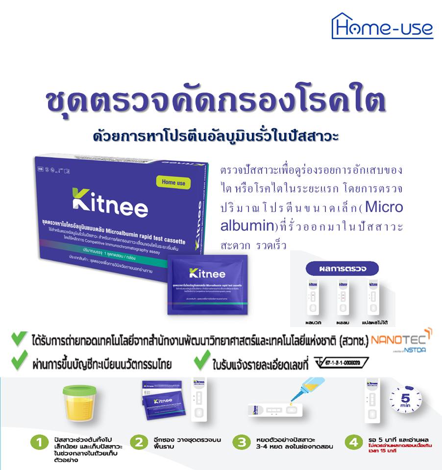 ชุดตรวจไมโครอัลบูมินแบบตลับ (Kitnee) เป็นเครื่องมือแพทย์สำหรับตรวจคัดกรองการรั่วของอัลบูมินในปัสสาวะแบบเชิงคุณภาพ สามารถใช้ตรวจด้วยตนเอง เพื่อคัดกรองภาวะผิดปกติของโรคไตในระยะเริ่มต้นได้อย่างสะดวกและรวดเร็ว