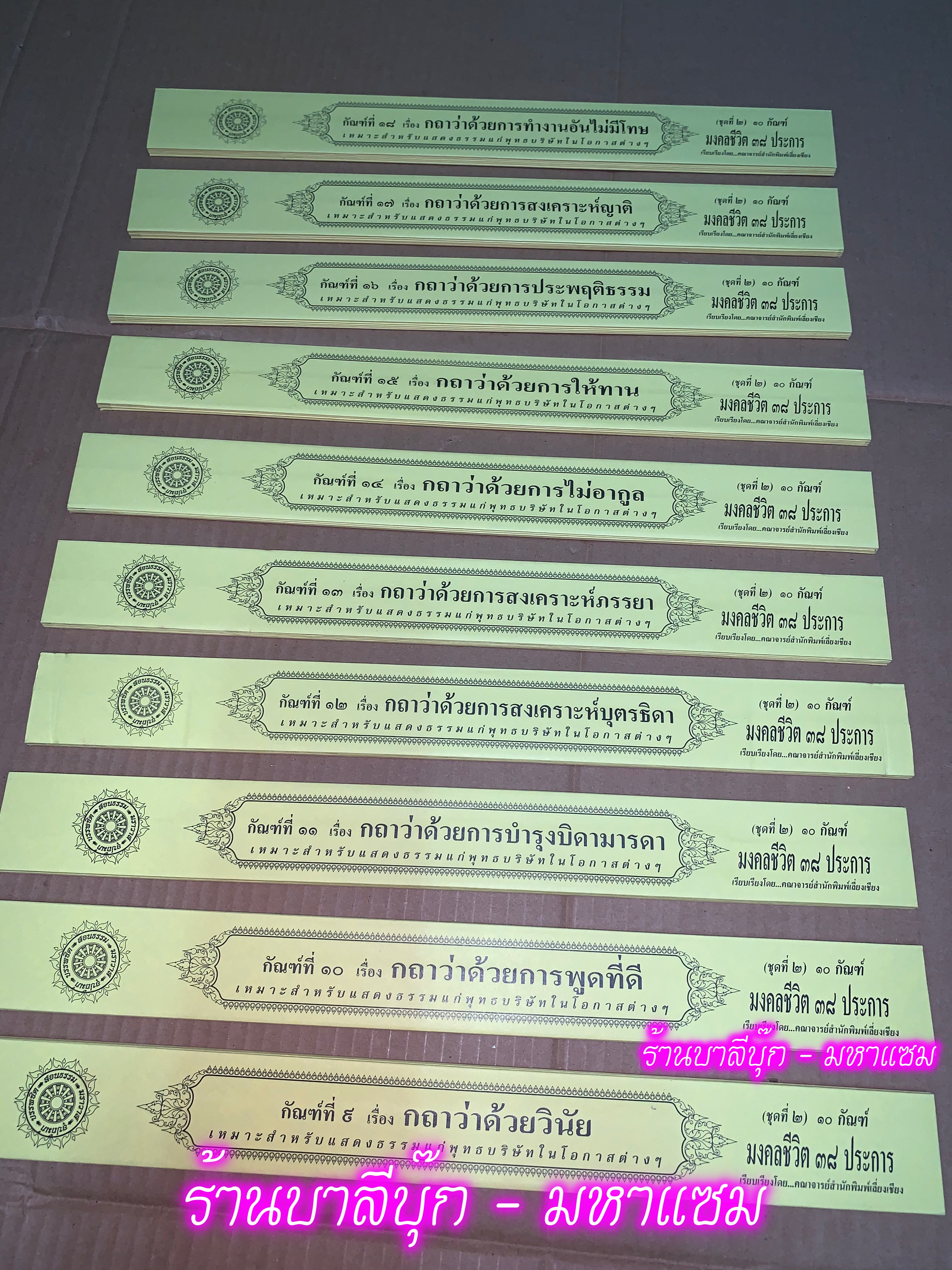 ชุดมงคลชีวิต ชุดที่ 2 - คัมภีร์เทศน์ กัณฑ์ชุด ชุดมงคลชีวิต 38 ประการ ชุดที่ 2 (มงคลชีวิต มี 4 ชุด) (วินัย-การงานไม่มีโทษ) รวม 10 กัณฑ์/เรื่อง - ใบลานกระดาษ - เหมาะสำหรับเทศน์ในโอกาสต่างๆ สำนวนสมัยใหม่ สามารถนำไปปฏิบัติให้เกิดประโยชน์สุขได้ - เลี่ยงเชี่ยง
