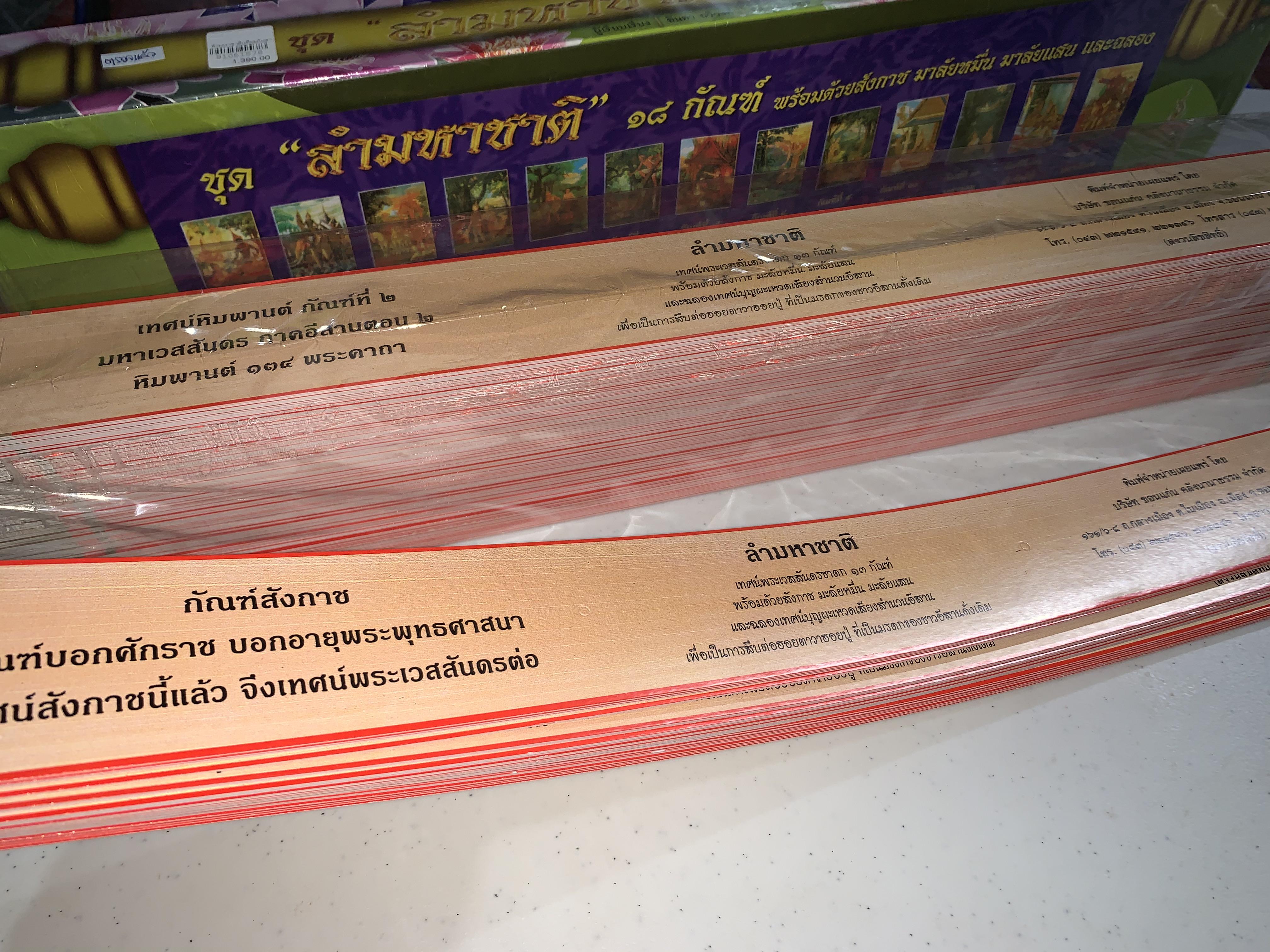 เทียมใบลานลำมหาชาติ 18 กัณฑ์ เป็นคัมภีร์เทศน์เวสสันดรชาดกตามสำนวนภาคอีสาน จัดทำในรูปแบบเทียมใบลาน เพื่อคงเอกลักษณ์และบรรยากาศของคัมภีร์โบราณ เนื้อหาครบถ้วนสำหรับการเทศน์งานบุญพระเวส ใช้ได้ทั้งในงานประเพณี งานบุญ และการศึกษาค้นคว้าทางพระพุทธศาสนา