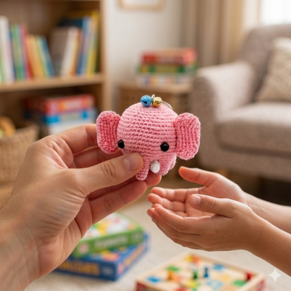 พวงกุญแจถักรูปช้างสีชมพู งานแฮนด์เมดถักอย่างประณีตด้วยไหมพรมคุณภาพดี ดีไซน์น่ารัก โทนสีหวานสดใส น้ำหนักเบา แข็งแรง เหมาะสำหรับห้อยกุญแจ กระเป๋า เป้ หรือใช้เป็นของขวัญและของที่ระลึกในโอกาสต่าง ๆ