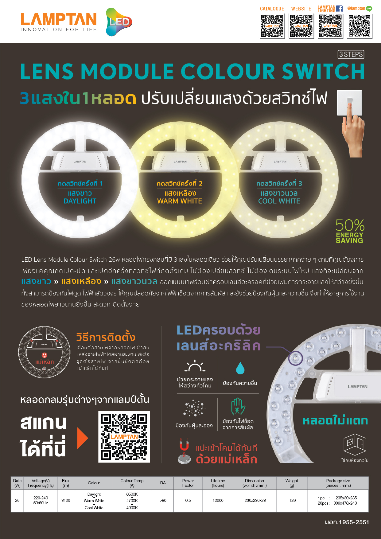 LENS MODULE COLOUR SWITCH | 26 WATT 3 แสงใน 1 หลอด ปรับเปลี่ยนแสงด้วยสวิทช์ไฟ