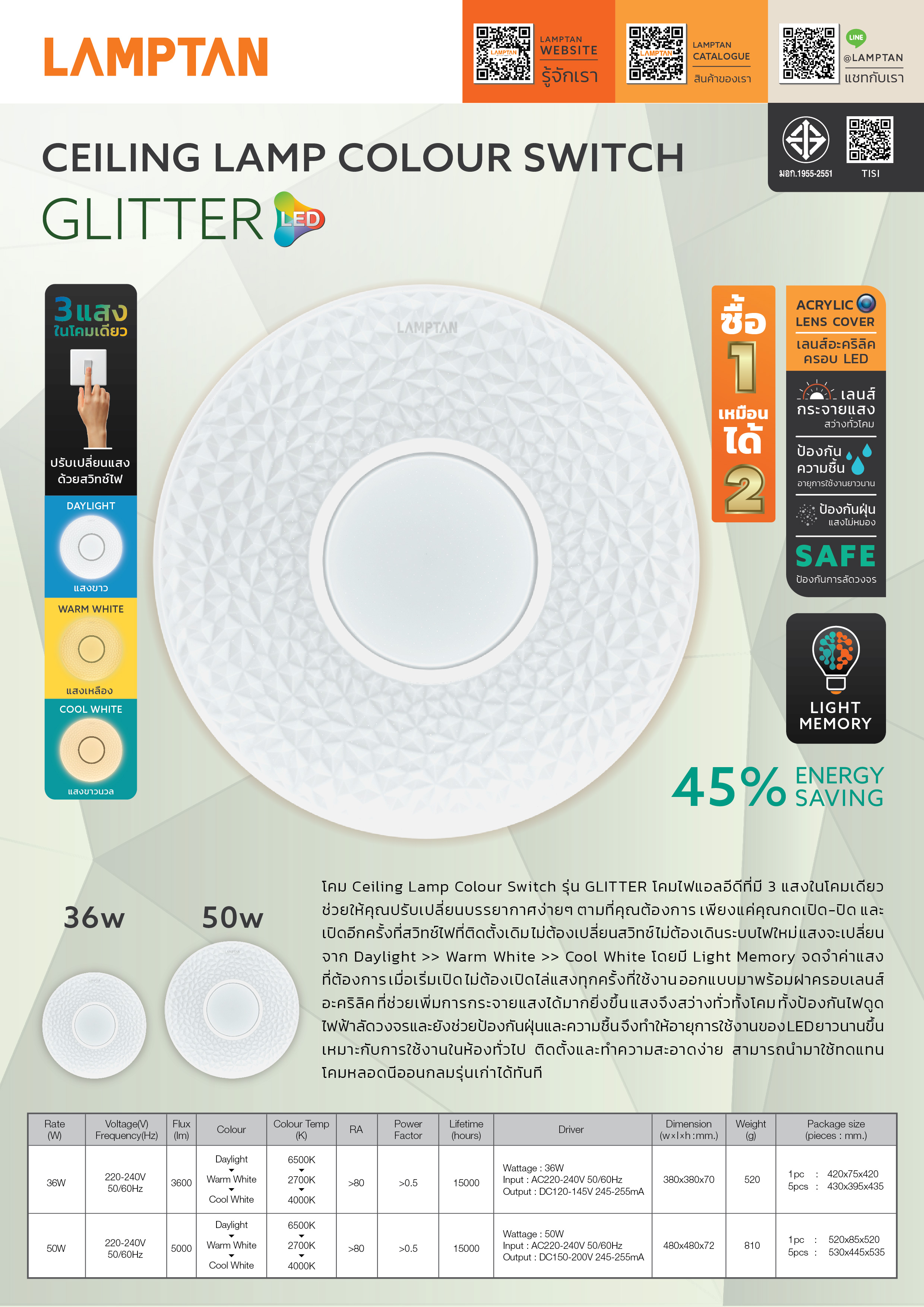 LAMPTAN โคมไฟเพดาน LED Ceiling Lamp Colour Switch รุ่น Glitter 36W