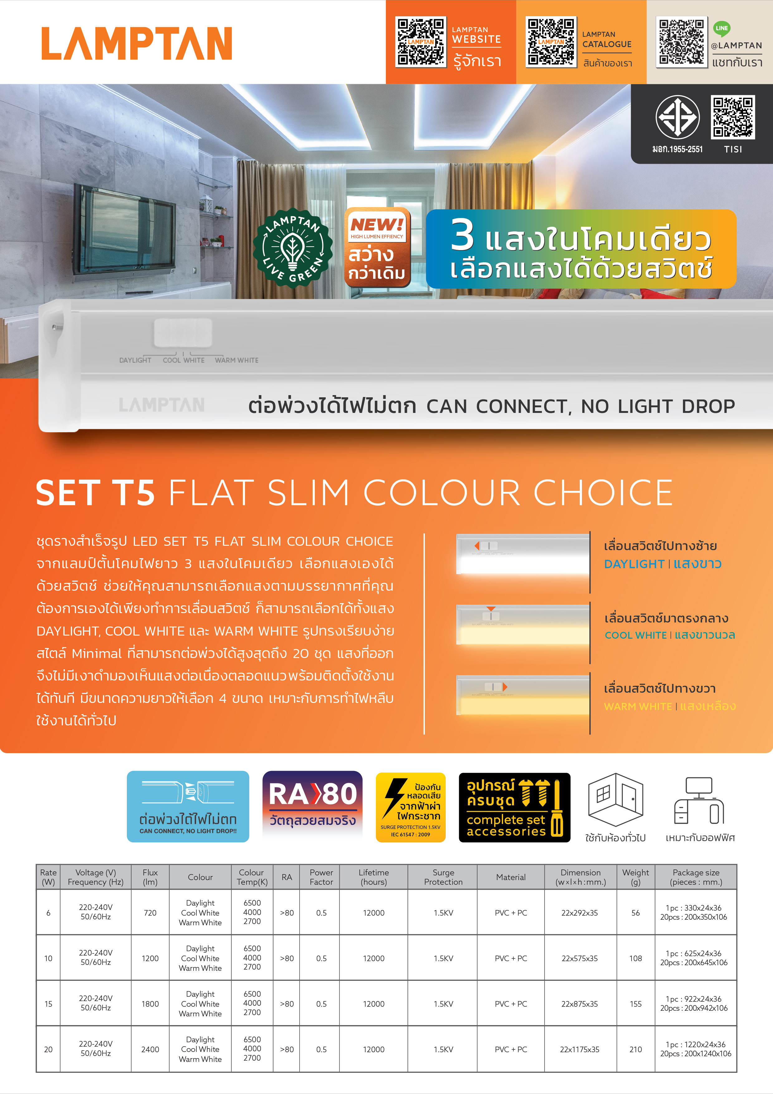 ชุดรางสำเร็จรูป LED SET T5 FLAT SLIM COLOUR CHOICE จากแลมป์ตั้นโคมไฟยาว 3แสงในโคมเดียว เลือกแสงเองได้ด้วยสวิตช์ ช่วยให้คุณสามารถเลือกแสงตามบรรยากาศที่คุณต้องการเองได้เพียงทำการเลื่อนสวิตช์ ก็สามารถเลือกได้ทั้งแสง DAYLIGHT, COOL WHITE และ WARM WHITE รูปทรงเรียบง่ายสไตล์ Minimal ที่สามารถต่อพ่วงได้สูงสุดถึง 20 ชุด แสงที่ออกจึงไม่มีเงาดำมองเห็นแสงต่อเนื่องตลอดแนวพร้อมติดตั้งใช้งานได้ทันที มีขนาดความยาวให้เลือก 4 ขนาด เหมาะกับการทำไฟหลืบ ใช้งานได้ทั่วไป