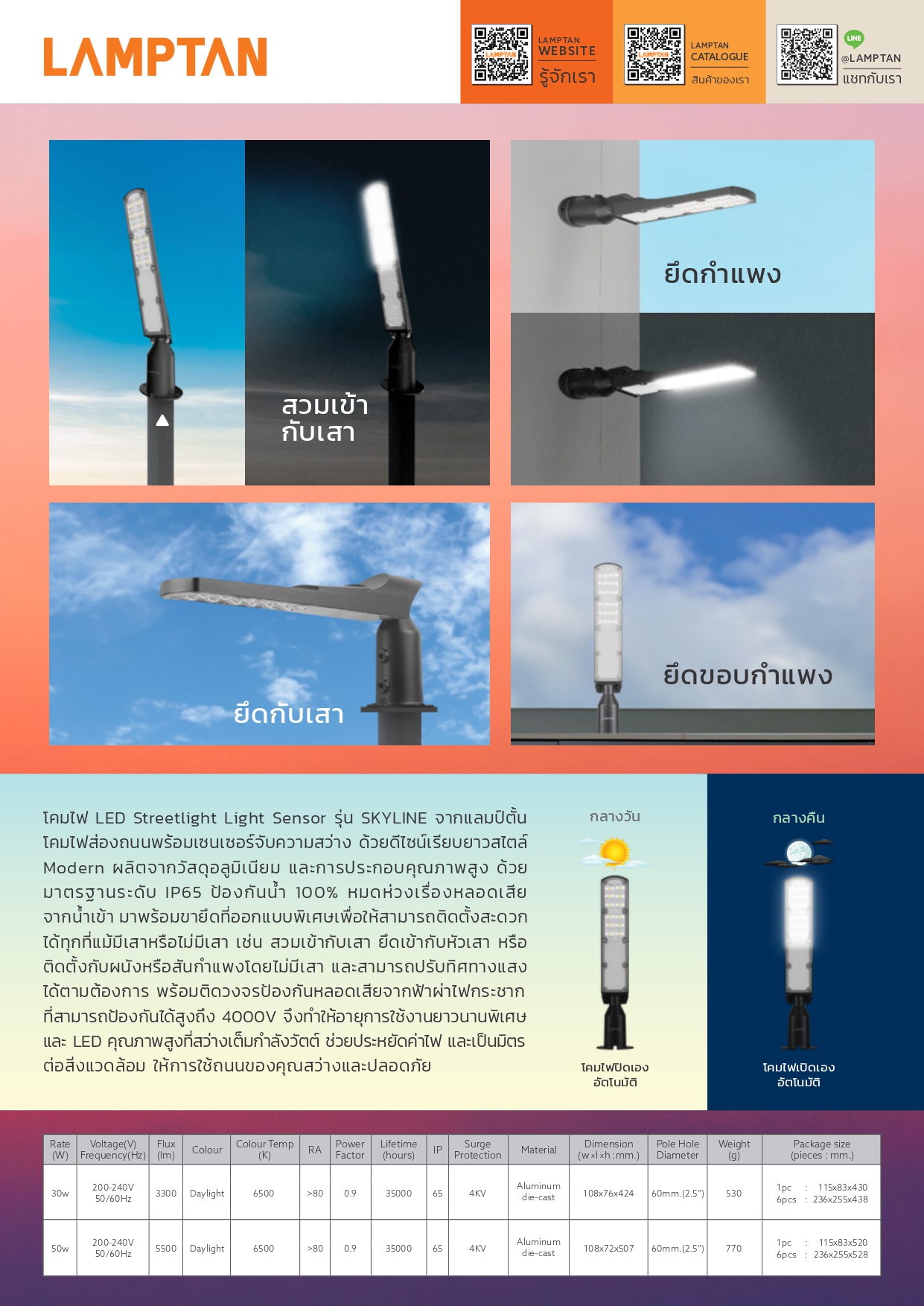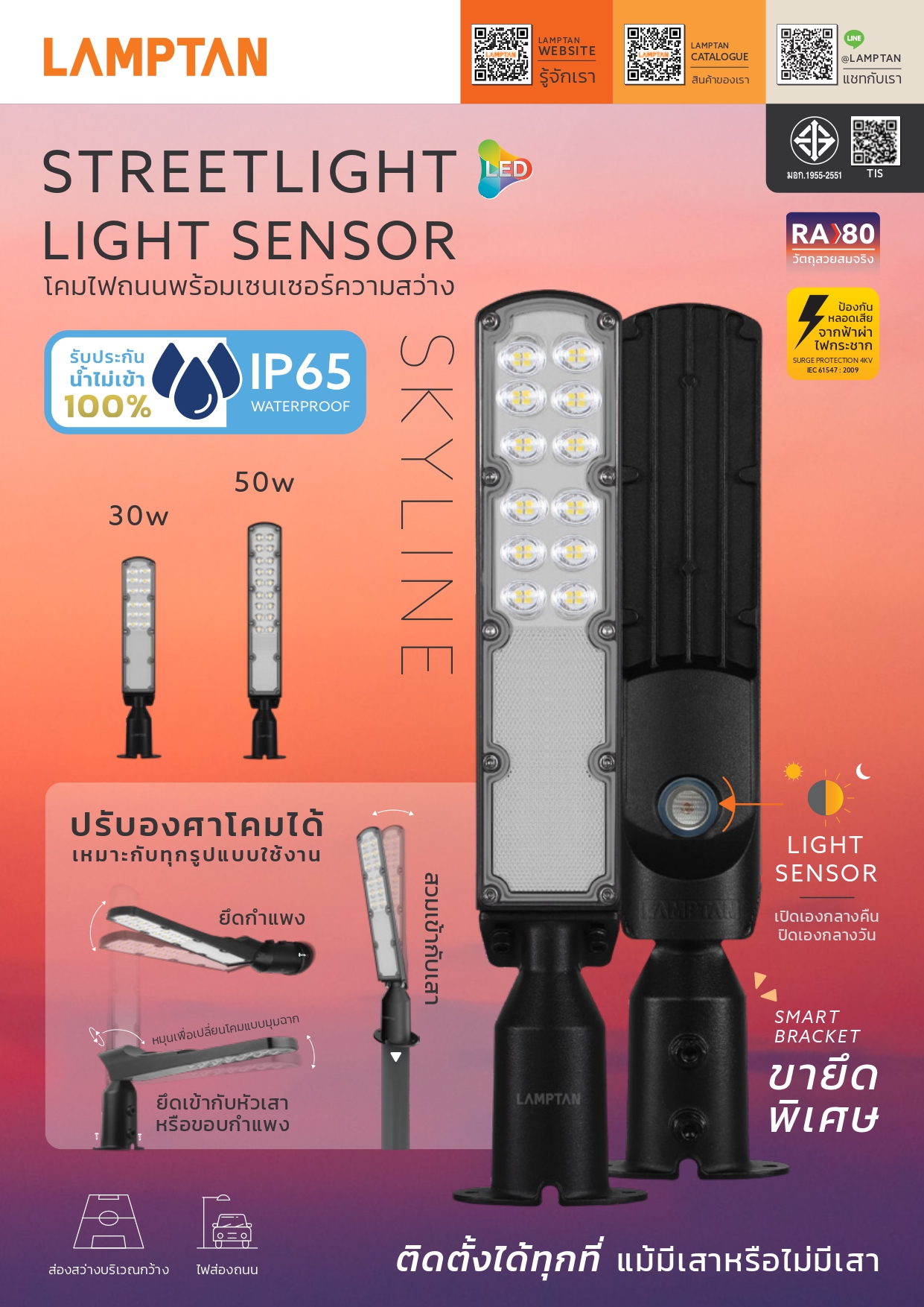 โคมไฟ LED Streetlight Light Sensor รุ่น SKYLINE จากแลมป์ตั้น โคมไฟส่องถนนพร้อมเซนเซอร์จับความสว่าง ด้วยดีไซน์เรียบยาวสไตล์ Modern ผลิตจากวัสดุอลูมิเนียม และการประกอบคุณภาพสูง ด้วยมาตรฐานระดับ IP65 ป้องกันน้ำ 100% หมดห่วงเรื่องหลอดเสียจากน้ำเข้า มาพร้อมขายึดที่ออกแบบพิเศษเพื่อให้สามารถติดตั้งสะดวกได้ทุกที่แม้มีเสาหรือไม่มีเสา เช่น สวมเข้ากับเสา ยึดเข้ากับหัวเสา หรือติดตั้งกับผนังหรือสันกำแพงโดยไม่มีเสา และสามารถปรับทิศทางแสงได้ตามต้องการ พร้อมติดวงจรป้องกันหลอดเสียจากฟ้าผ่าไฟกระชาก ที่สามารถป้องกันได้สูงถึง 4000V จึงทำให้อายุการใช้งานยาวนานพิเศษ และ LED คุณภาพสูงที่สว่างเต็มกำลังวัตต์ ช่วยประหยัดค่าไฟ และเป็นมิตรต่อสิ่งแวดล้อม ให้การใช้ถนนของคุณสว่างและปลอดภัย