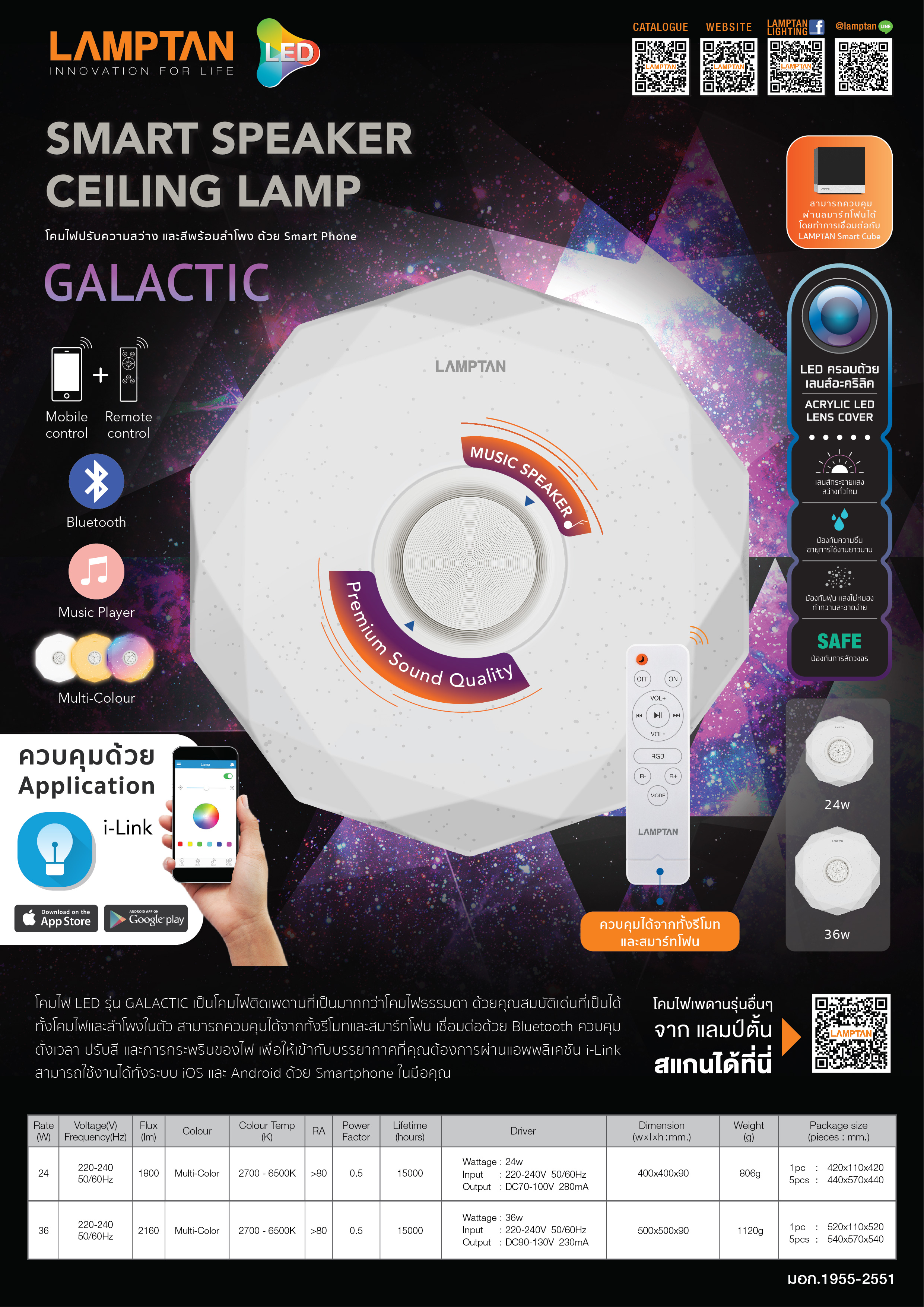 โคมไฟLED รุ่น Galactic ปรับความสว่างและสีพร้อมลำโพง ด้วย Smart Phone เป็นโคมไฟติดเพดานที่เป็นมากกว่าโคมไฟธรรมดา ด้วยคุณสมบัติเด่นที่เป็นได้ทั้งโคมไฟและลำโพงในตัว สามารถควบคุมได้จากทั้งรีโมทและสมาร์ทโฟน เชื่อมต่อด้วย Bluetooth ควบคุมตั้งเวลา ปรับสี และการกระพริบของไฟ เพื่อให้เข้ากับบรรยากาศที่คุณต้องการผ่านแอปพลิเคชัน i-Link สามารถใช้งานได้ทั้งระบบ iOS และ Android ด้วย Smartphone ในมือคุณ