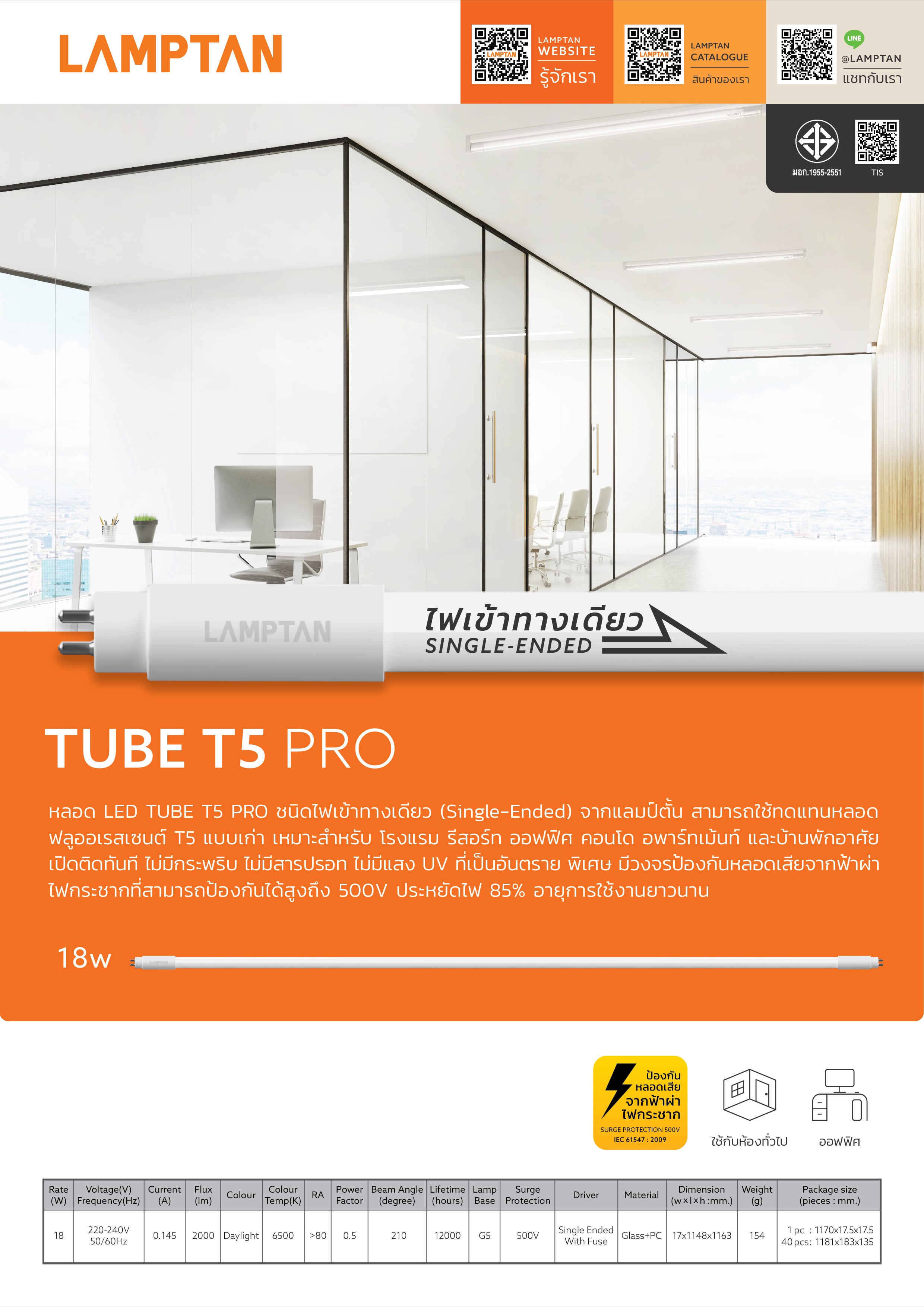 หลอด LED TUBE T5 PRO ชนิดไฟเข้าทางเดียว (Single-Ended) จากแลมป์ตั้น สามารถใช้ทดแทนหลอดฟลูออเรสเซนต์ T5 แบบเก่า เหมาะสำหรับ โรงแรม รีสอร์ท ออฟฟิศ คอนโด อพาร์ทเม้นท์ และบ้านพักอาศัย เปิดติดทันที ไม่มีกระพริบ ไม่มีสารปรอท ไม่มีแสง UV ที่เป็นอันตราย พิเศษ มีวงจรป้องกันหลอดเสียจากฟ้าผ่าไฟกระชากที่สามารถป้องกันได้สูงถึง 500V ประหยัดไฟ 85% อายุการใช้งานยาวนาน