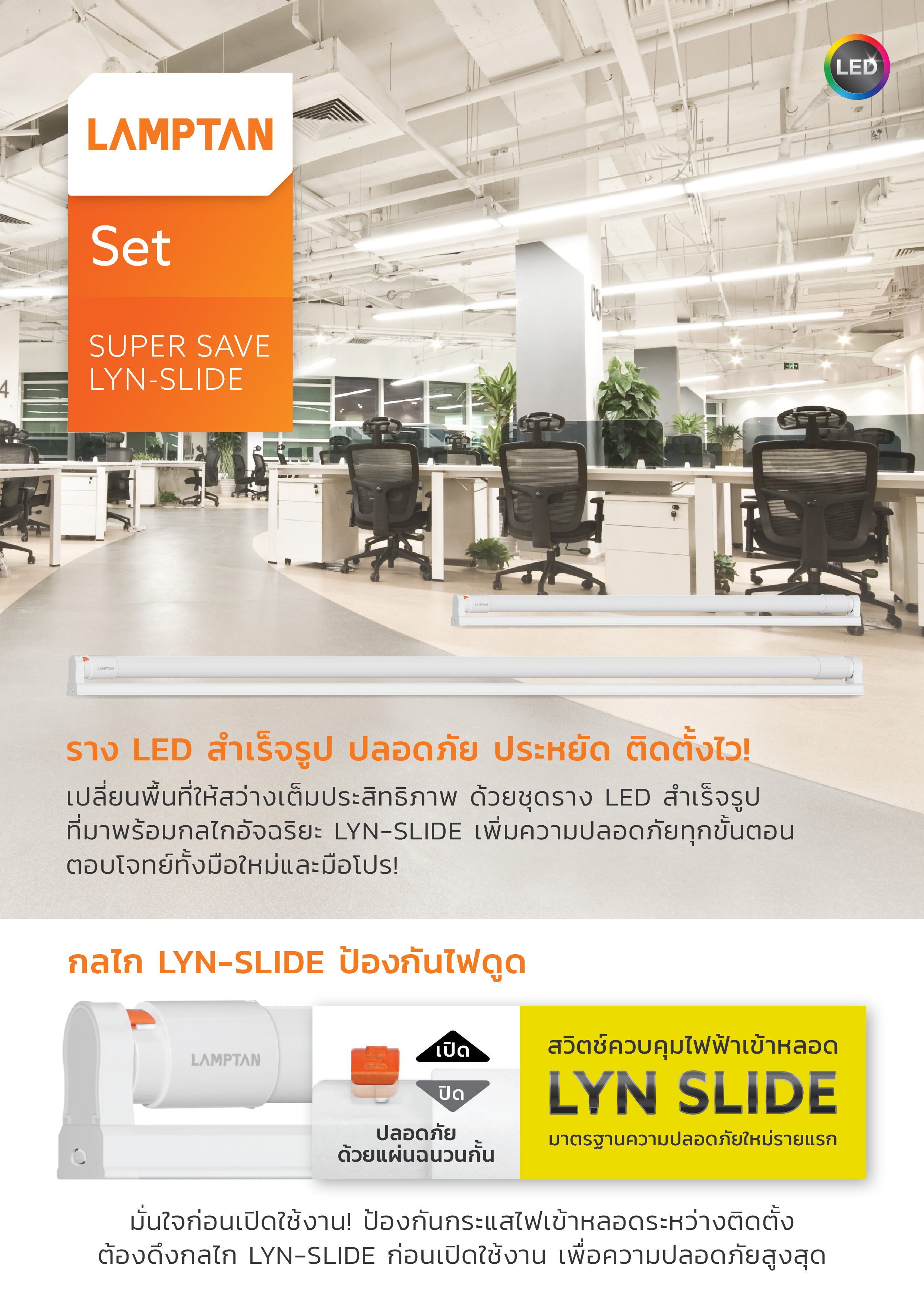 ชุดรางสำเร็จรูป SET SUPER SAVE LYN-SLIDE ชุดรางสำเร็จรูป LED ปลอดภัย ประหยัด ติดตั้งไว จากแลมป์ตั้น เปลี่ยนพื้นที่ให้สว่างเต็มประสิทธิภาพด้วยชุดราง LED สำเร็จรูปที่มาพร้อมกลไกอัจฉริยะ LYN-SLIDE เพิ่มความปลอดภัยทุกขั้นตอน ตอบโจทย์ทั้งมือใหม่และมือโปร มั่นใจก่อนเปิดใช้งาน