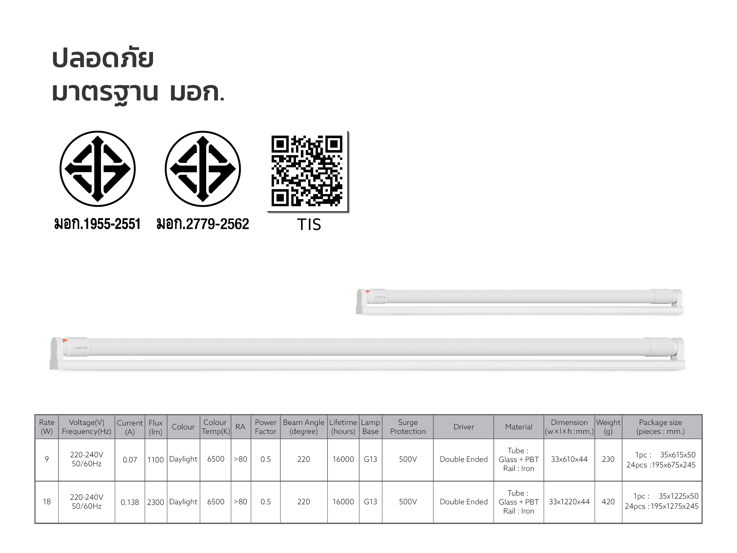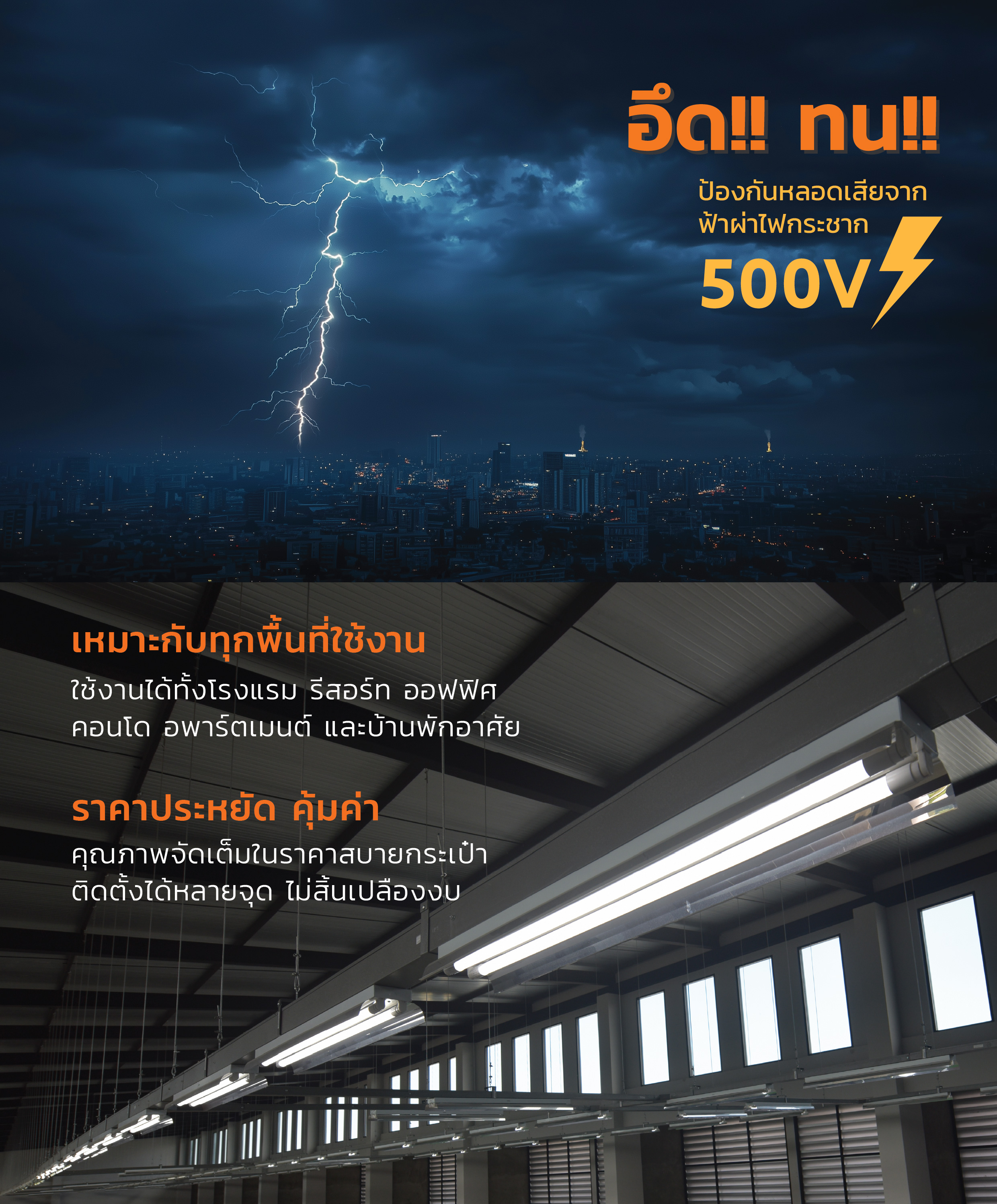 - มีวงจรป้องกันหลอดเสียจากฟ้าผ่าไฟกระชากที่ป้องกันได้สูงถึง 500V