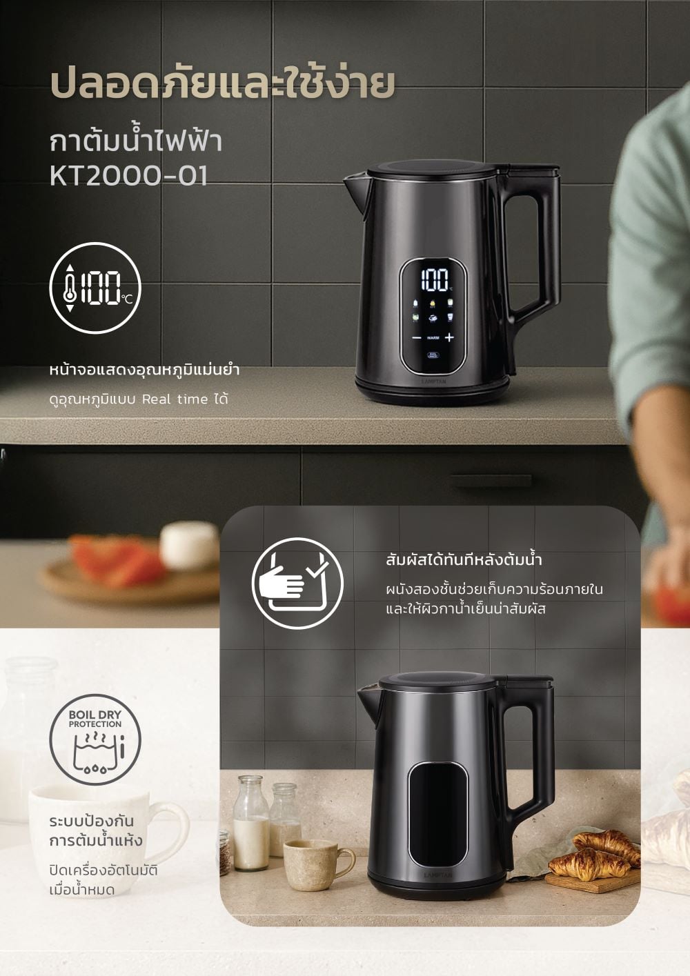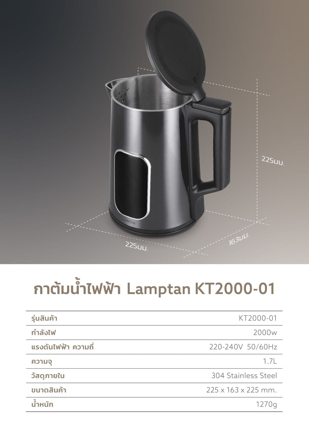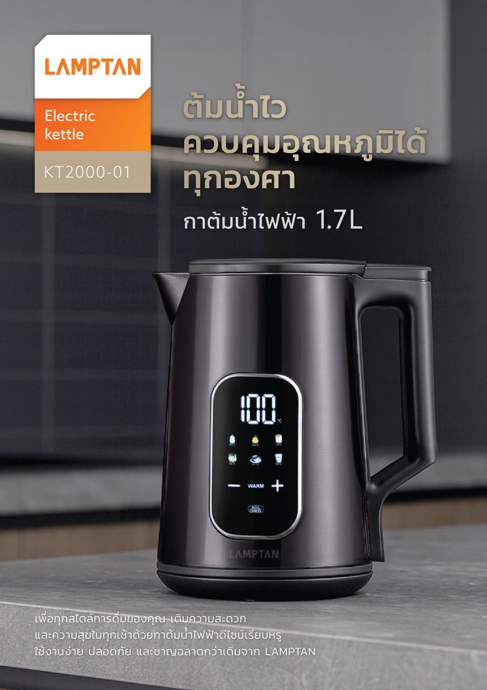 กาต้มน้ำไฟฟ้า Electric Kettle KT2000-01 จากแลมป์ตั้น ต้มน้ำไวควบคุมอุณหภูมิได้ทุกองศา ความจุ 1.7ลิตร เพื่อทุกสไตล์การดื่มของคุณเติมความสะดวกและความสุขในทุกเช้าด้วยกาต้มน้ำดีไซน์เรียบหรู ใช้งานง่าย ปลอดภัย และชาญฉลาดกว่าเดิม