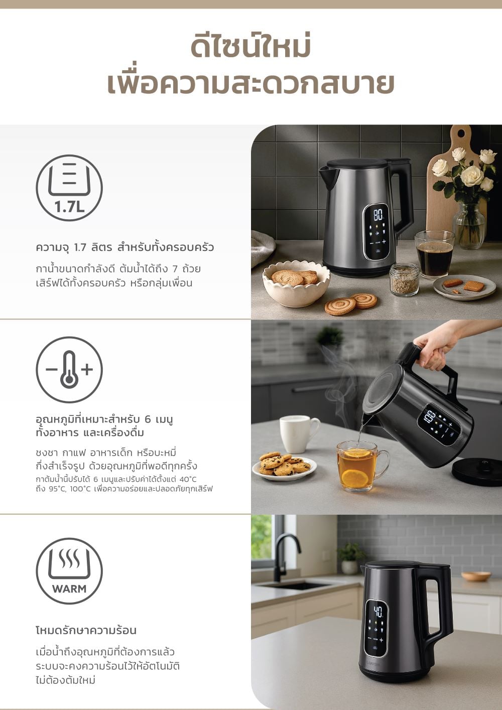 - โหมดรักษาความร้อน เมื่อน้ำถึงอุณหภูมิที่ต้องการ ระบบจะคงความร้อนไว้ให้อัตโนมัติ